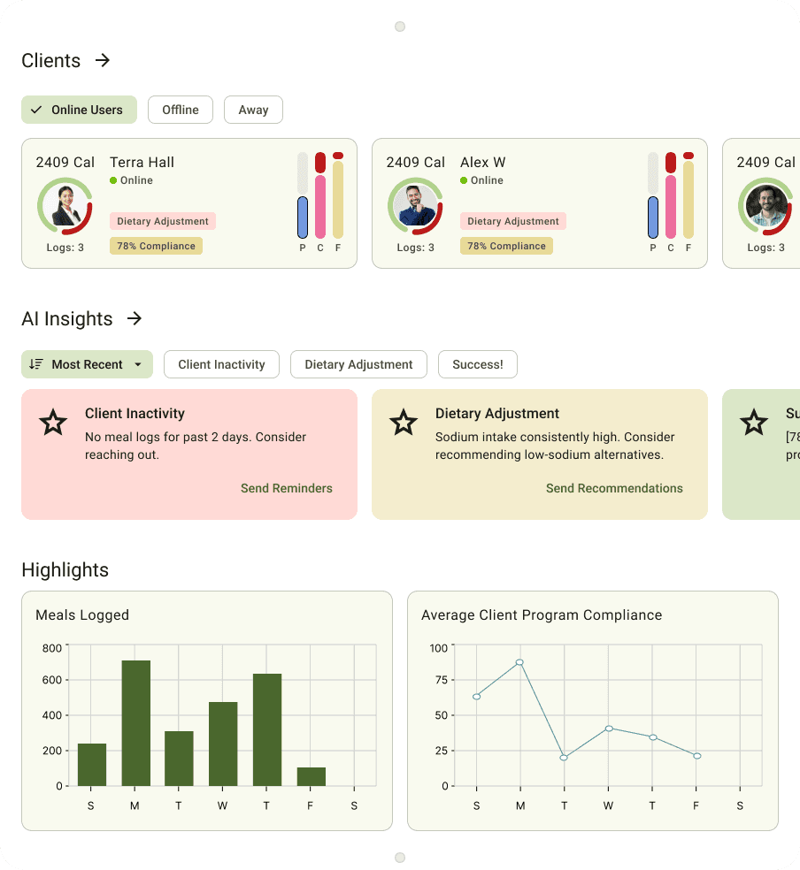 Harness real-time client insights—meal logs, macro/micro nutrient breakdowns, and AI alerts—all in one intuitive dashboard.
